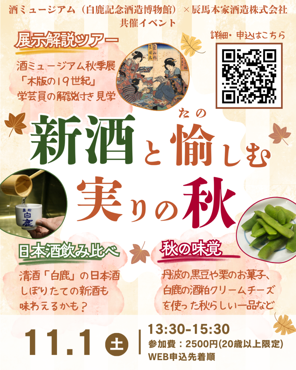 酒ミュージアム(白鹿記念酒造博物館)記念館で開催中の秋季展「木版の19世紀」解説付きガイドツアーと、辰馬本家酒造株式会社内「宜春苑」にて柿や長芋、丹波の黒豆などの秋ならではの食材を使ったおつまみと白鹿の日本酒の試飲が楽しめる特別イベント「新酒と愉しむ実りの秋」の開催が決定しました🍶