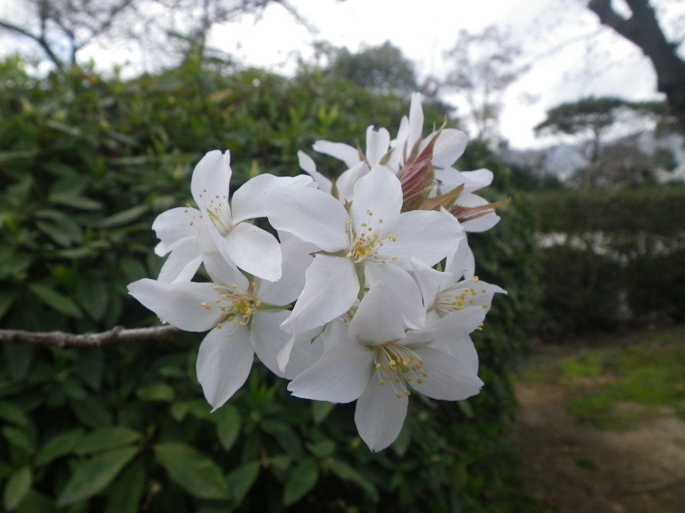 「越水早咲き」はその名の通り、西宮市内の越水浄水場に原木がある品種です。花弁が厚く、中央で少し折れ曲がるように咲くのが特徴です。開花時期は3月中旬から下旬で、染井吉野よりも1週間ほど早く咲きます。越水浄水場では昭和29年(1954)から笹部さんによる桜の植樹と管理指導が行われました。笹部さんは個性豊かな実生の桜を自身の演習林「亦楽山荘」(兵庫県宝塚市)や向日町苗圃(京都府向日市)で育て、各地へ移植する桜の木もここから提供していました。越水早咲きはその時に植えられた桜のうちのひとつではないかと考えられています。